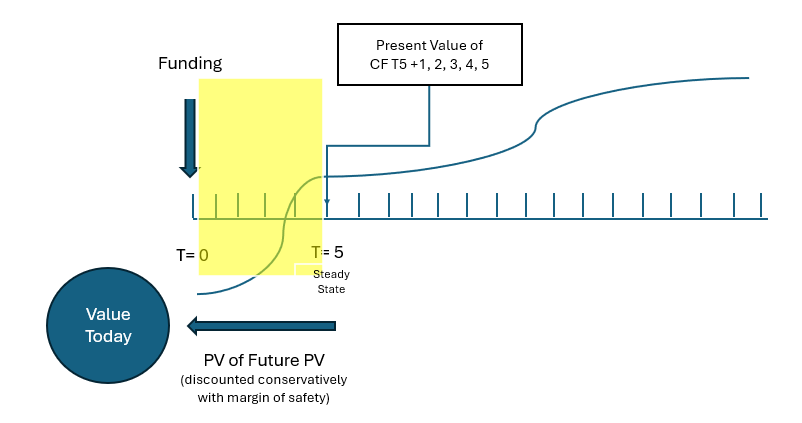 It’s about understanding where your money takes you, and what your steady state looks like at that future point in time (T-=5), then bringing that back to the present (T=0) to understand your range of values. I know this sounds strange and most textbooks (and schools) teach DCF as a static equation (I have yet to find one that talks about taking the present value of a future present value), but in the high growth world, it is the opposite of static. Your business is not a powerplant, or a mall, or a widget manufacturer. It is a high burn machine with exponential demand and extreme risk. If you look at the graph above, the yellow area indicates the high-risk high-growth phase where cash is utilized up to the steady state.